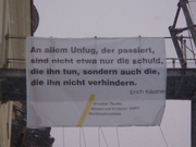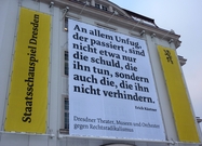 Dresdner Theater, Museen und Orchester gegen Rechtsradikalismus Unter diesem Motto haben sich in Dresden in diesem Jahr zahlreiche Kulturinstitutionen zusammengetan, um ihrem Protest gegen Neonazis gemeinsam eine Stimme zu geben und in der Stadt deutlich sichtbar zu machen. Vom 9. bis 19. Februar zitieren die teilnehmenden Häuser an ihren Fassaden einen Satz von Erich Kästner: „An allem Unfug, der passiert, sind nicht etwa nur die schuld, die ihn tun, sondern auch die, die ihn nicht verhindern.“ Mit dieser gemeinsamen Aktion, einem symbolischen Schulterschluss, wollen wir zum bürgerschaftlichen Protest gegen Rechts aufrufen – verbunden mit der Hoffnung, dass ein breiter Protest aller Bürgerinnen und Bürger den braunen Spuk in unserer Stadt jetzt und in der Zukunft verhindert. |